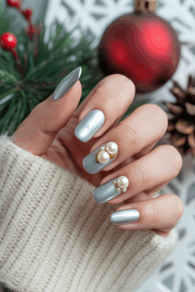 This design uses a soft pale gray with a satin finish for a smooth, matte look. Small pearls are added on a few nails to give a subtle, elegant touch. The combination is simple but adds a refined detail perfect for winter holidays.