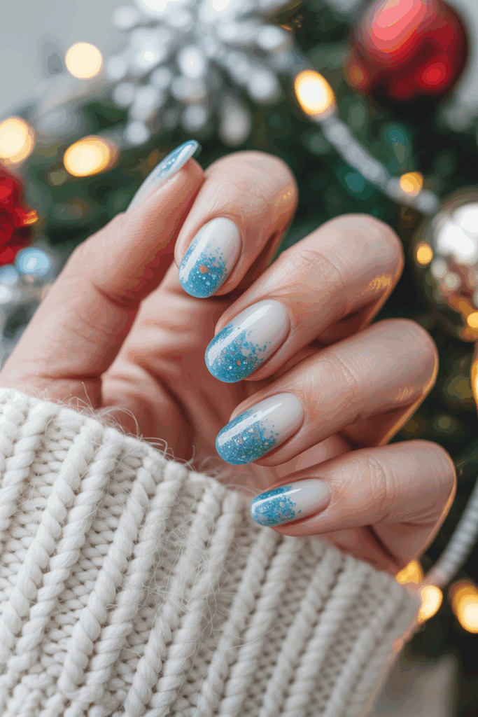 This design blends snowy white with a smooth blue glitter gradient. The blue sparkle adds depth and catches the light.