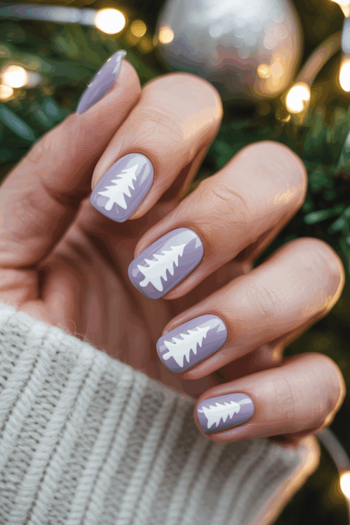This design features a soft lavender base that looks calm and fresh. White pine tree silhouettes add a simple, wintery touch. The contrast between lavender and white keeps the nails elegant yet festive. It works well for those who want subtle holiday nail art.