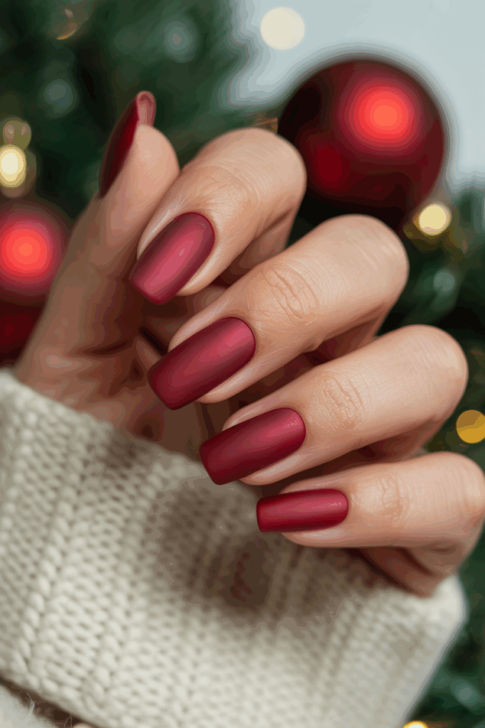 Velvet red nails with a matte finish create a soft, elegant look. The matte texture adds depth without shine. This style fits well with winter’s cozy and calm atmosphere. It suits both casual days and formal holiday events.