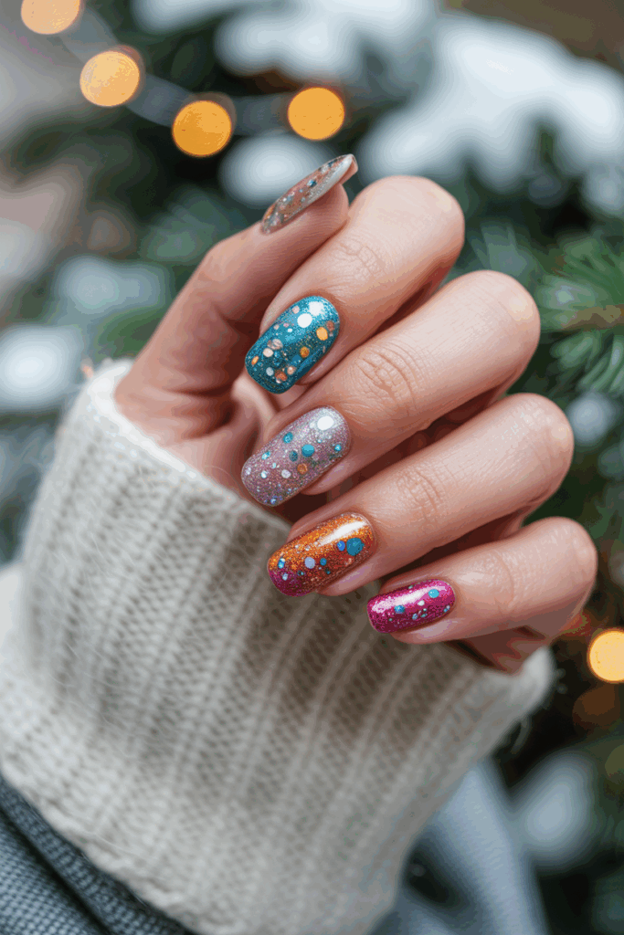 Colorful sparkle nails use bright shades mixed with glitter for a fun look. This design catches light and adds shine without being too bold.