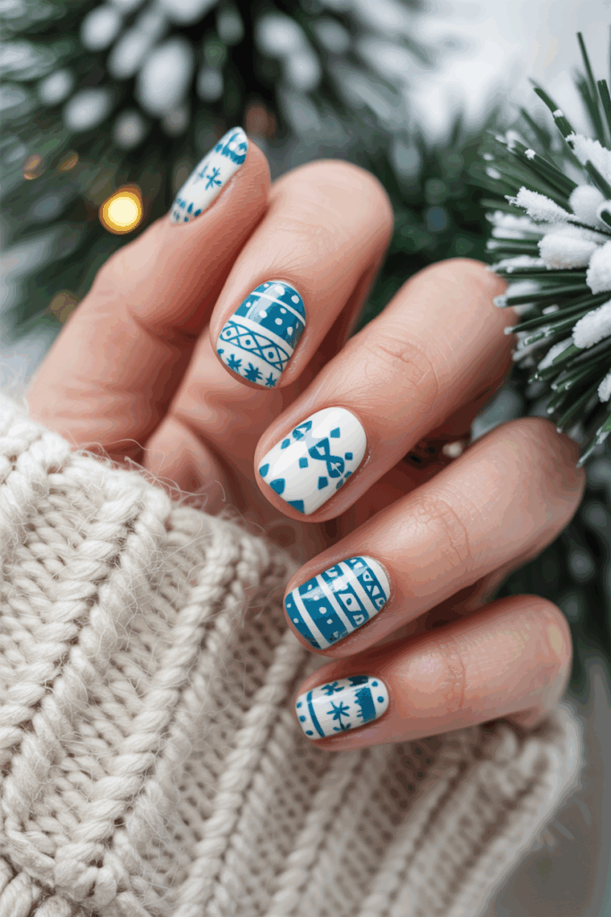 Cozy sweater pattern nails feature designs that look like knitwear. They use textures and patterns similar to cable-knit or Fair Isle sweaters.