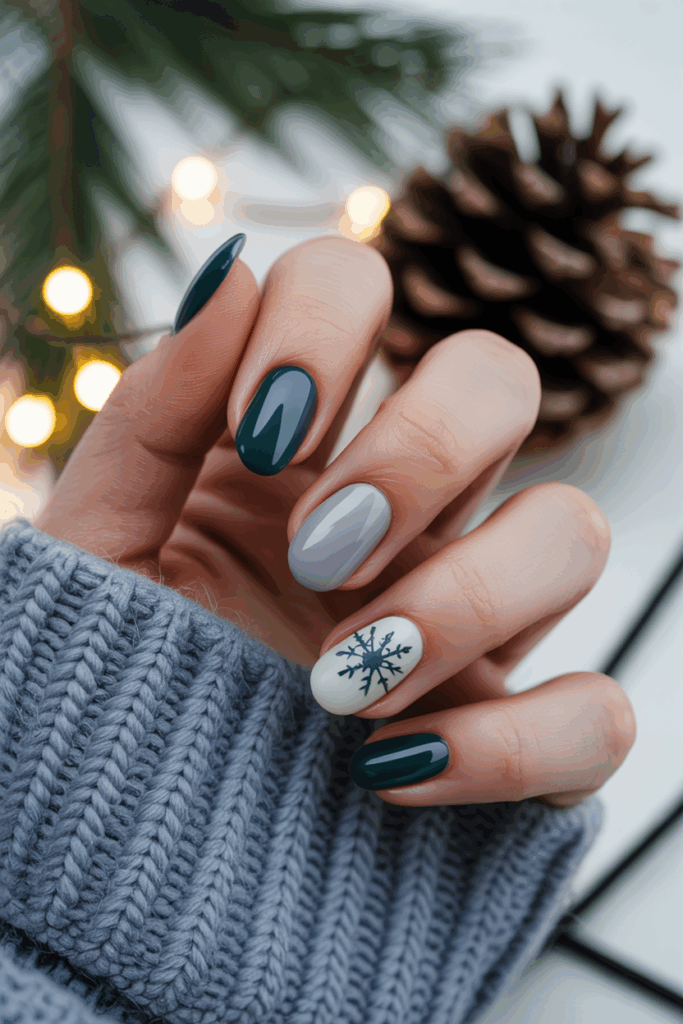 A dark or neutral base color helps the white or silver snowflakes stand out. Varying snowflake sizes on each nail adds visual interest without being too busy.