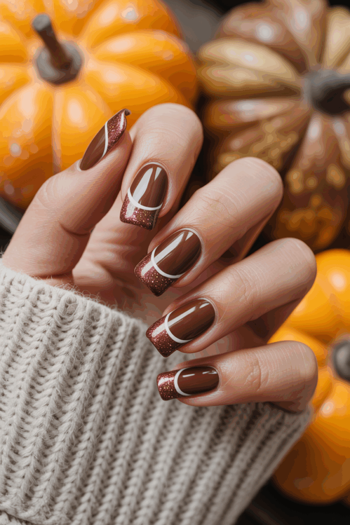 This design features chocolate brown nails with glitter applied just on the tips. It adds a subtle sparkle without being too flashy. The glitter creates a smooth fade from dark brown to shimmer, perfect for September’s fall vibe.