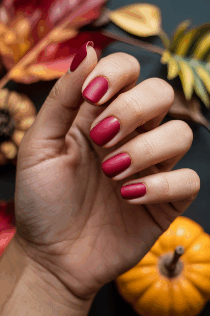 A bold cherry red matte finish offers a rich, deep color without shine. It gives nails a modern, sophisticated look.