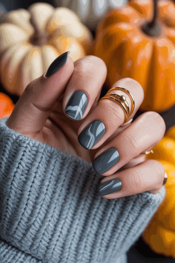 Charcoal grey nails with a marble effect create a stylish and modern look. The dark base contrasts with soft, flowing swirls that give the nails a natural, stone-like appearance. This design works well for both casual and formal occasions.