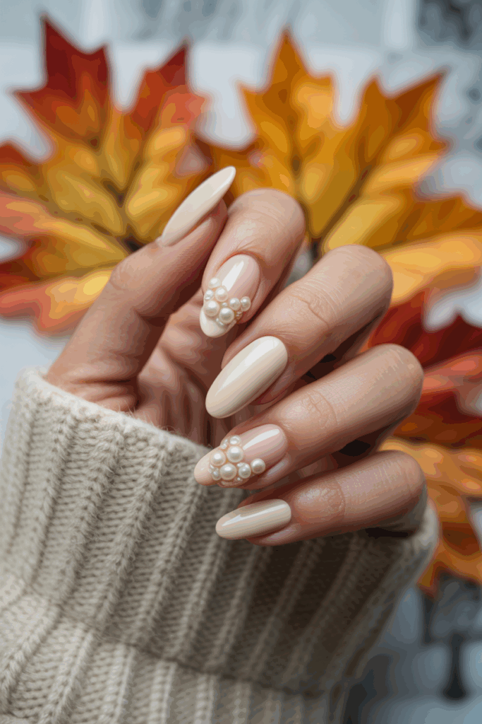 This design features a soft, creamy base on almond-shaped nails. Pearls add a delicate, elegant touch that stands out without being too flashy. It suits both casual and formal occasions, offering a balanced and refined look.