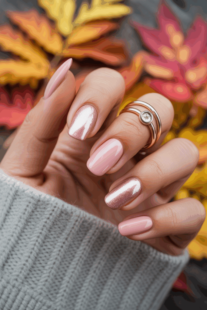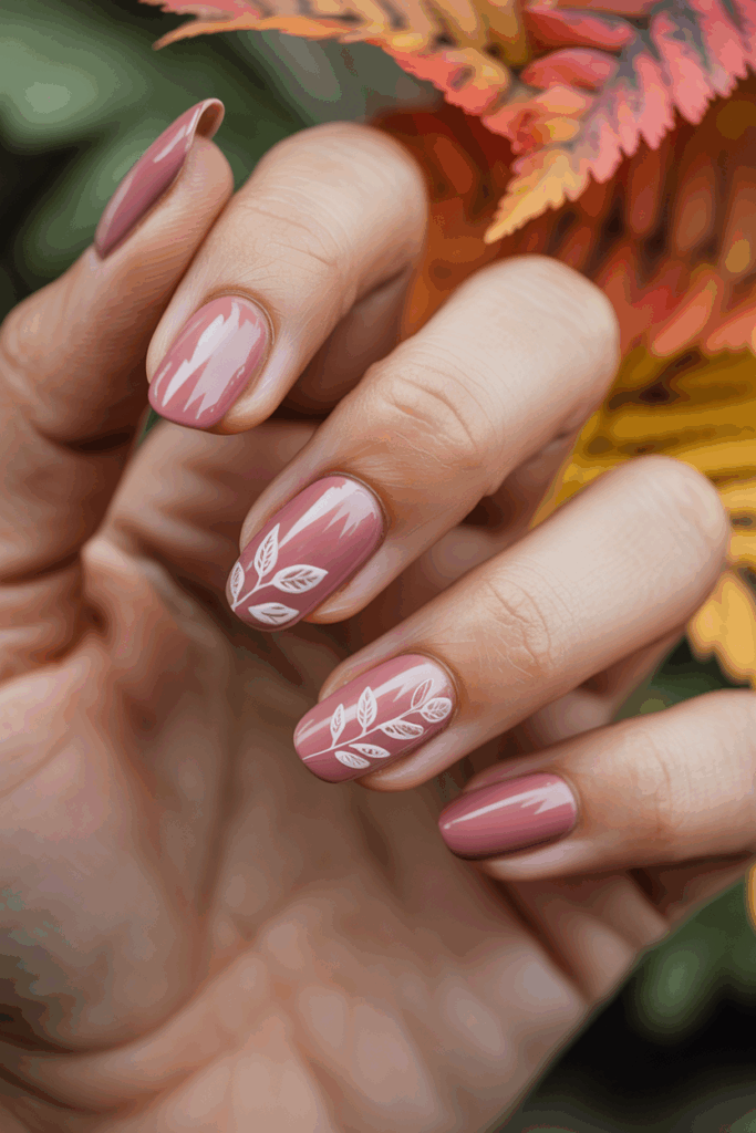 This design pairs a soft dusty rose base with simple leaf patterns. The leaves are often minimalist and placed on one or two accent nails. It suits short, rounded nails and usually features a matte finish for a subtle look.