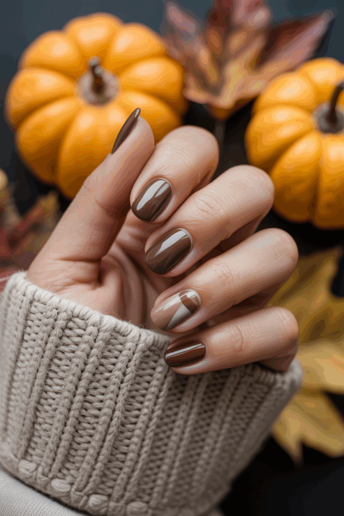 Thick brown strokes at the tips or base highlight the color while keeping the style simple and elegant. It suits those who want a subtle but stylish manicure.