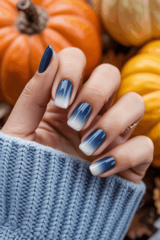 Navy blue ombre nails blend dark and light shades smoothly. This style works well for September and suits many occasions. It offers a sleek, modern look without being too bold. Navy blue ombre can be simple or have soft designs, making it versatile for fall.