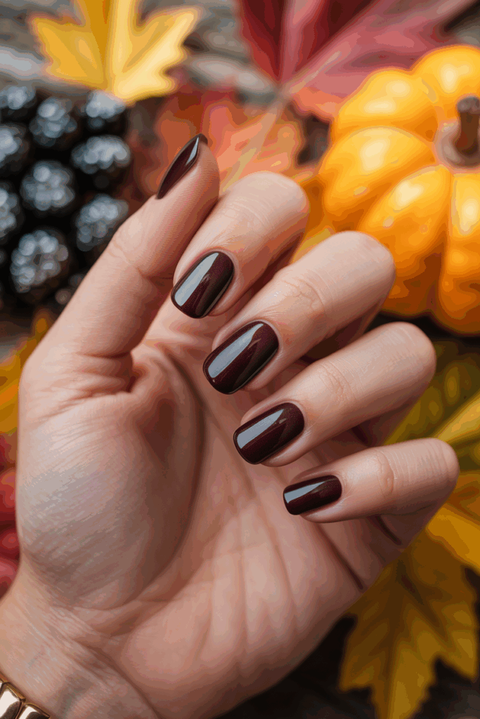 This design features a deep, glossy blackberry color. It offers a bold but elegant look suitable for fall. The shine adds a polished finish that works well for both casual and formal styles. It pairs nicely with simple nail art or left solid for a sleek effect.