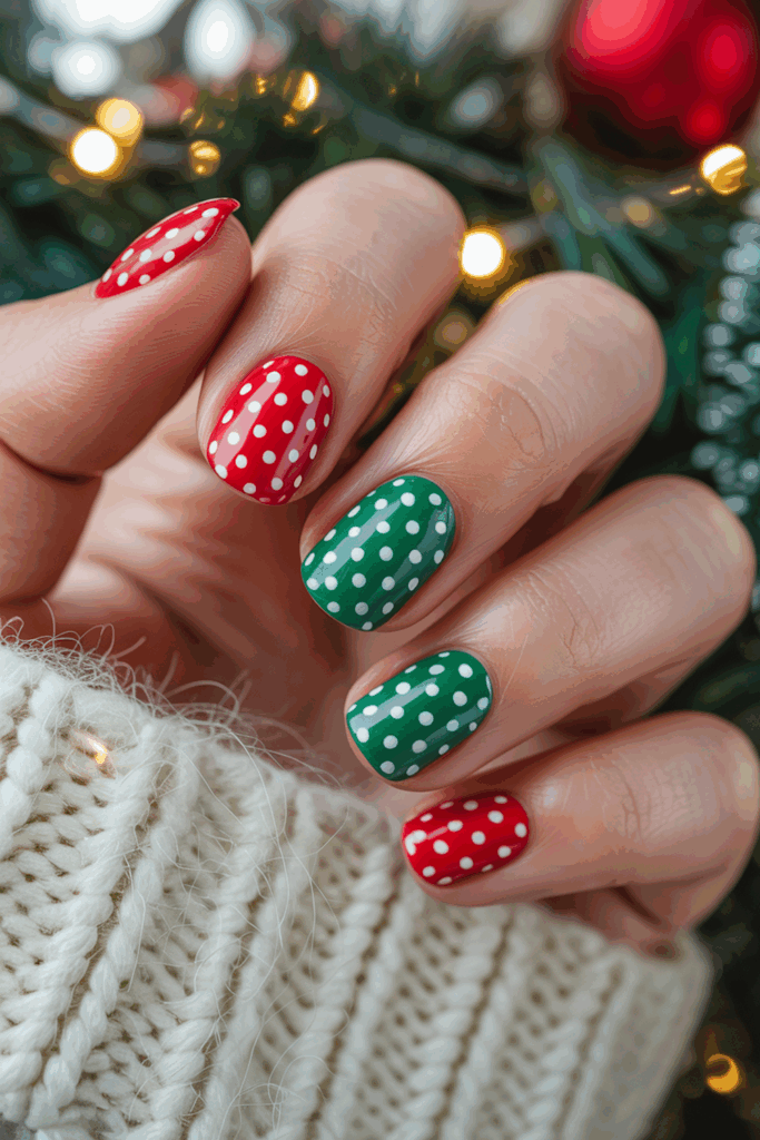 Different-sized dots add visual interest without making the nails look busy. It works well on short nails and fits any holiday outfit.