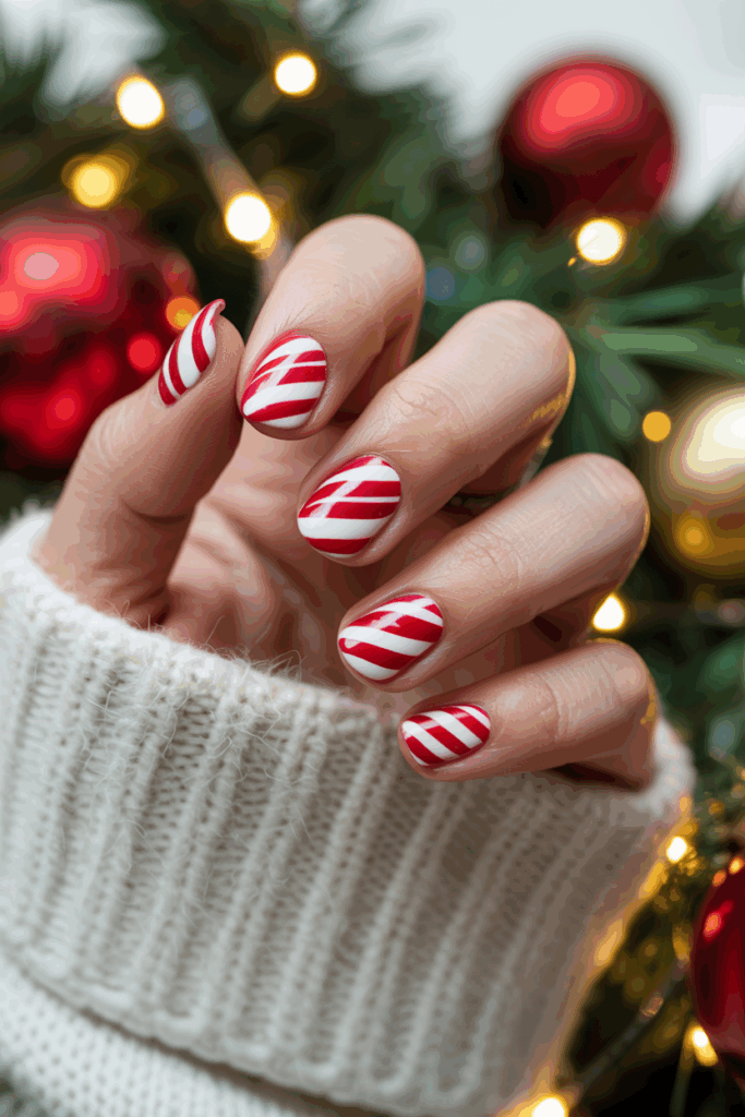 Candy cane stripes are a classic Christmas nail design. They usually feature red and white stripes that mimic the look of a candy cane. This simple pattern works well on short nails and adds a festive touch without being too bold.