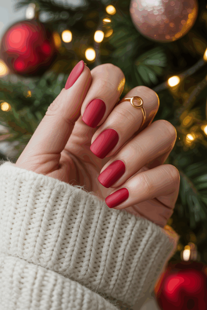 This style features short nails painted in a deep red color with a matte finish. The matte look gives a smooth, non-shiny surface that feels modern and elegant.