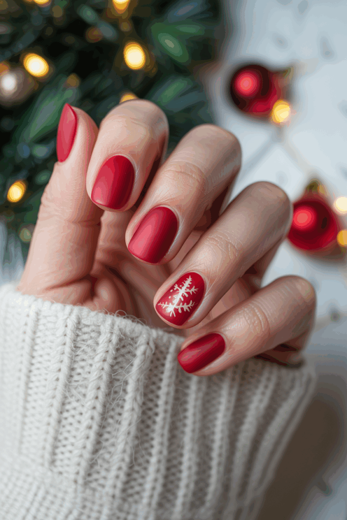 Sometimes, a few nails have simple white patterns like snowflakes to add a festive touch. This design is perfect for those who want a clean and cozy holiday look without extra sparkle.