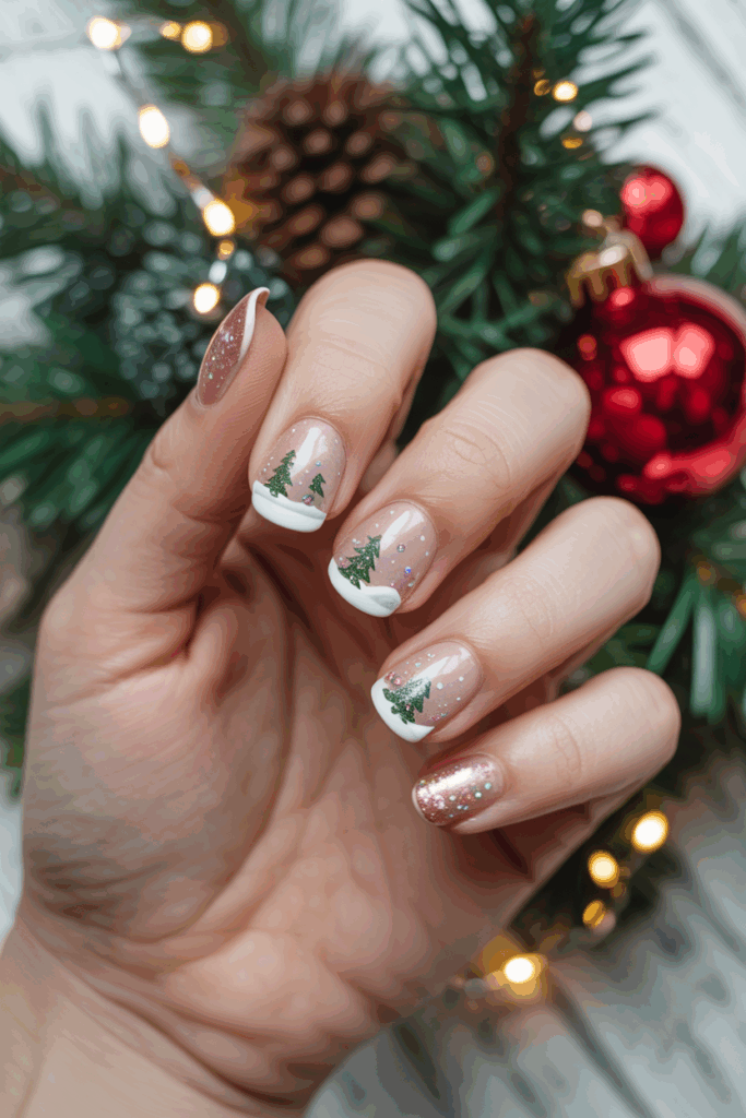 This design uses glitter to mimic the look of a snow globe. It works well on short nails by adding sparkle without being too busy.