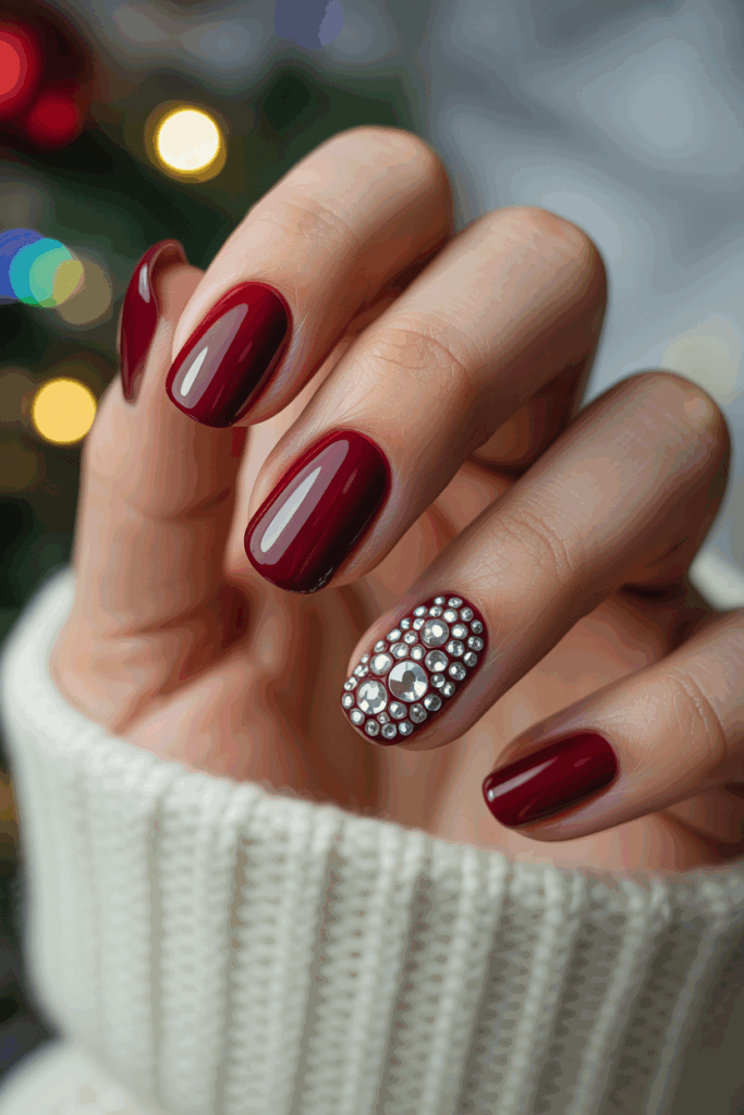 This design uses a deep, glossy burgundy polish as the base color. The rich shade fits well with the winter and holiday season.