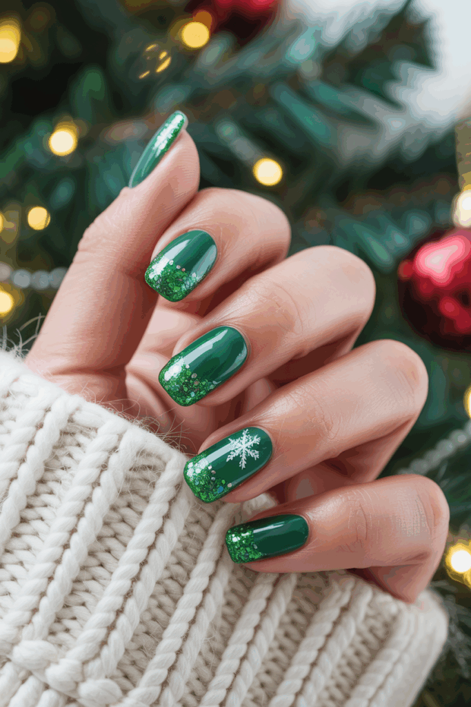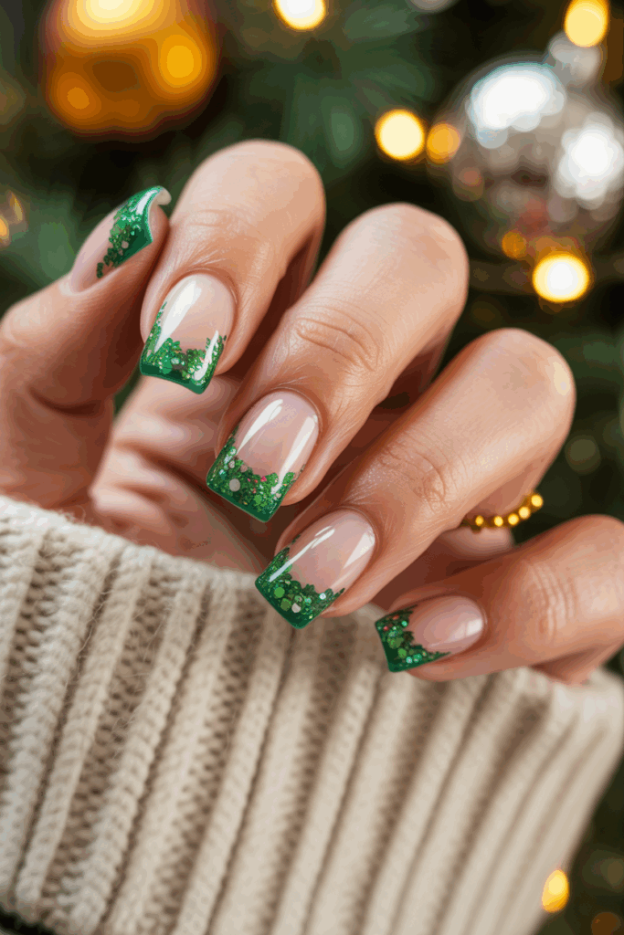 Green glitter tips add a festive sparkle to short nails without overwhelming them. They give a clean, stylish look that works for many occasions.