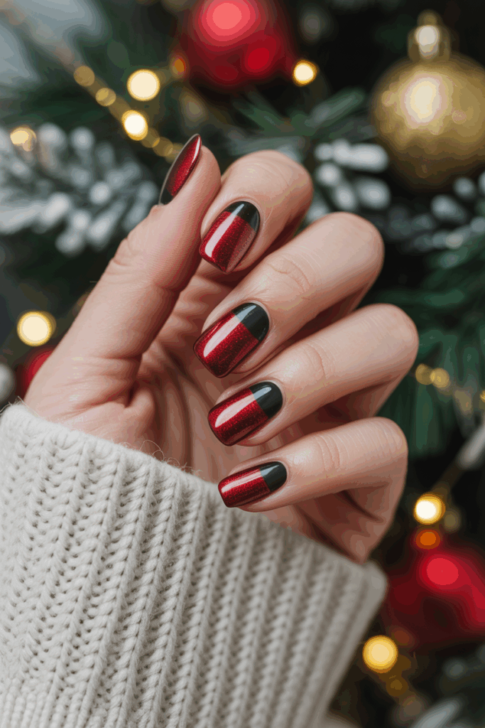 This design pairs shiny metallic red nails with bold black details. The metallic red gives a festive yet modern look.