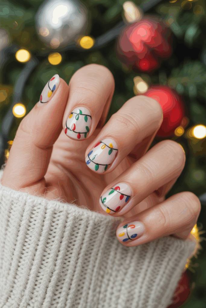 This design features tiny, colorful Christmas lights painted on short nails. It uses small dots or lines to represent glowing bulbs.