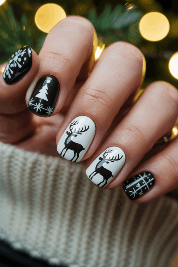 Reindeer silhouettes are a simple yet stylish choice for short Christmas nails. They usually feature a dark outline of the reindeer on a light or neutral background.