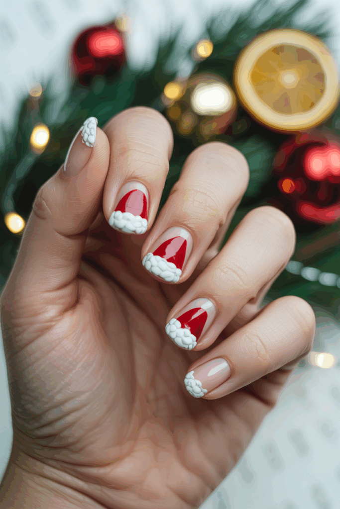 Santa hat nail art is a popular choice for short Christmas nails. It uses the classic red and white colors to create a festive look.