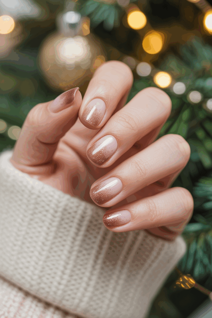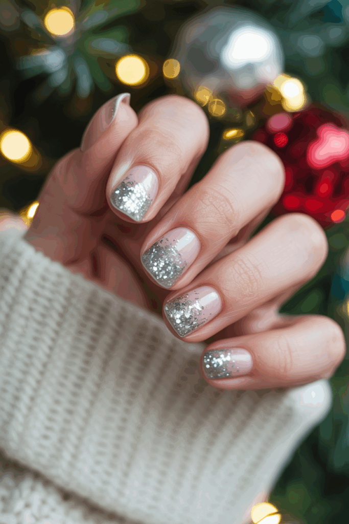 The silver glitter gradient is a simple yet stylish choice for short Christmas nails. It starts with a nude or sheer base color that looks clean and natural.