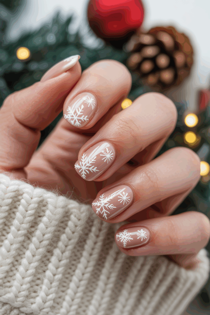This style uses a soft nude base with delicate white snowflakes painted on top. The contrast creates a clean and elegant look that fits the holiday season.