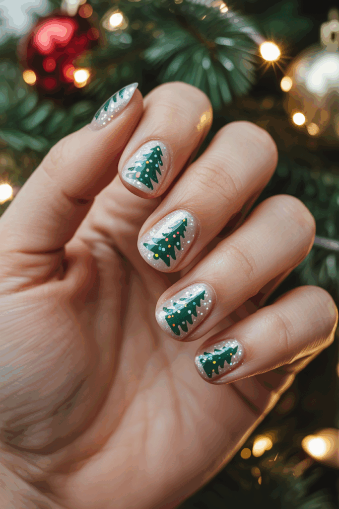 The sparkly pine tree motif is a simple but festive design for short nails. It uses glitter to highlight the shape of a Christmas tree.