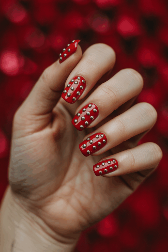 This design pairs a bright red base with small silver studs for a sharp look. The studs add a metallic touch that stands out on short square nails.
