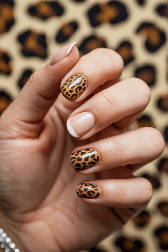 This design features one or two nails with a cheetah print while the rest are a solid color. It adds a bold touch without being overwhelming. The accent nail works well on short square nails for a trendy, stylish look.