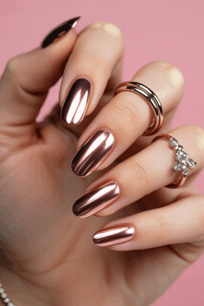 This design features a shiny, reflective rose gold chrome that fits short square nails well. It adds a sleek and modern touch without extra decorations. The smooth metallic finish works for both casual and formal styles.