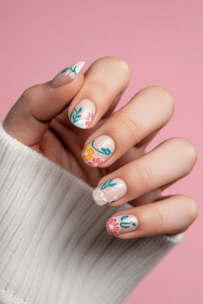 The flowers use fine lines and soft colors to keep the style minimal. It works well for those who like subtle nail art.