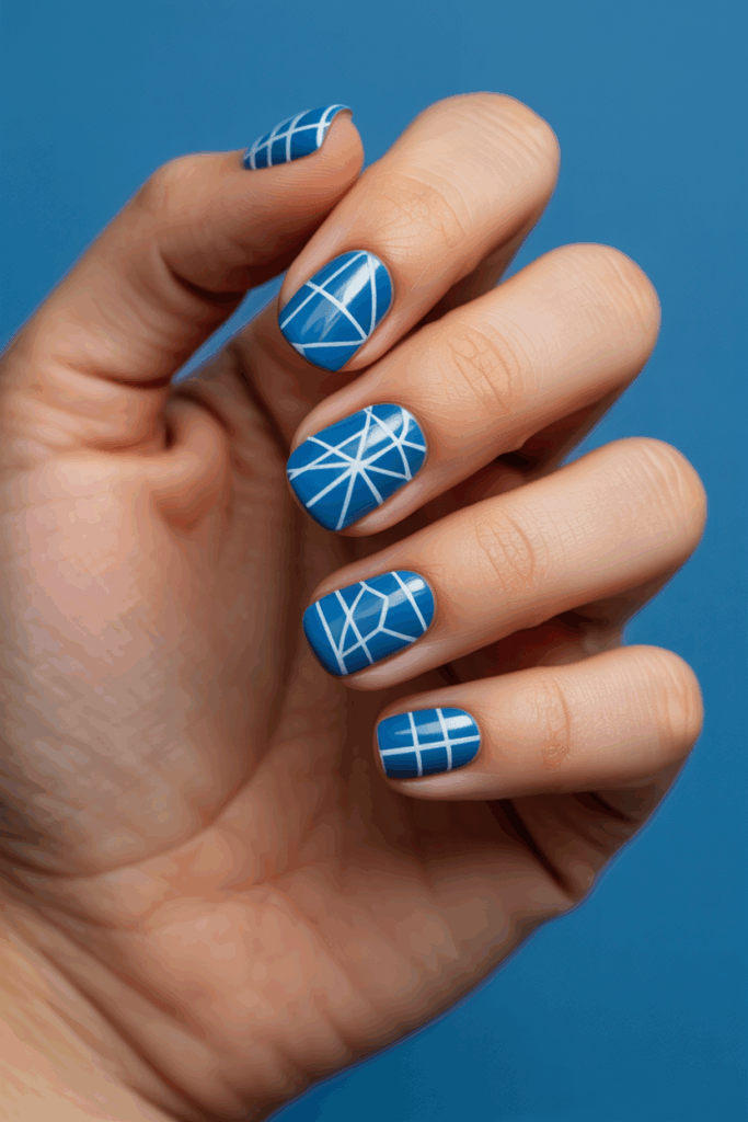Geometric patterns on short square nails create a clean and modern look. The sharp edges of the nails match well with shapes like lines, triangles, and squares. Blue shades add depth and interest without being too busy. These designs suit both casual and formal styles.