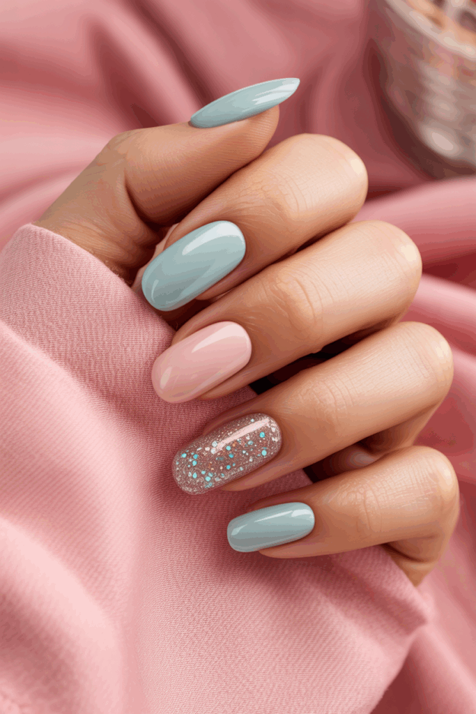 Glitter accent nails add a touch of sparkle without overwhelming the whole look. They work well on short square nails, highlighting one or two fingers for balance.