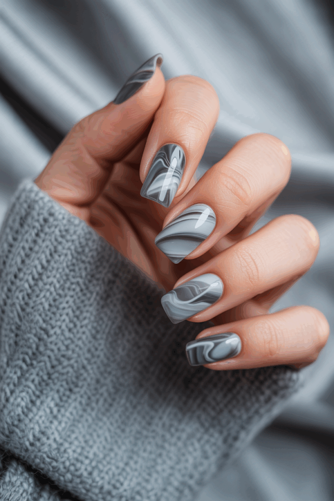 The marble effect in grey tones offers a sleek and modern look for short square nails. It mixes shades of grey with white or black veins for a subtle, natural stone appearance. This design fits well with both casual and formal styles.