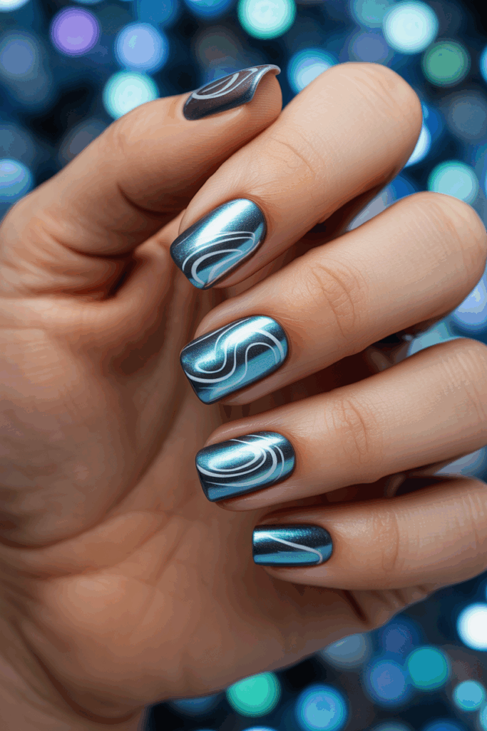 This design uses metallic silver polish with smooth, swirling patterns. The swirls add a creative detail to short square nails without overwhelming them. It gives a polished and modern feel that suits many styles.