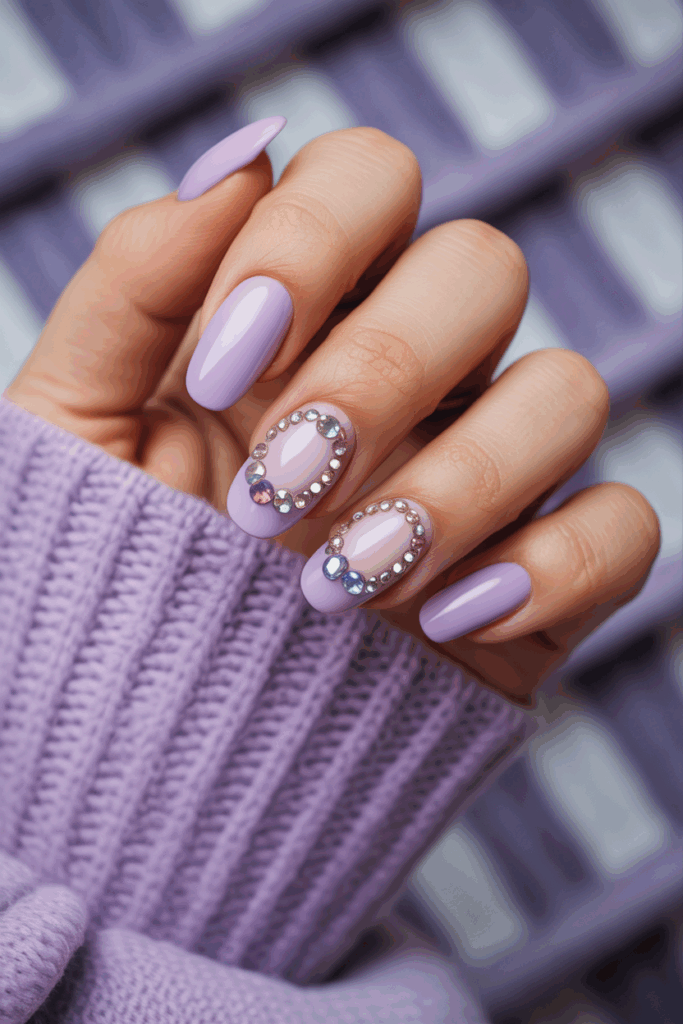 This design features a soft lavender base that looks calm and elegant. Rhinestones are added on one or two nails to create a subtle shine.