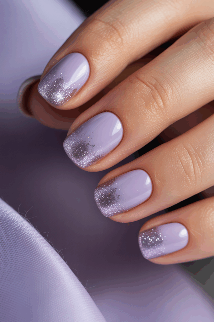This look pairs soft lavender polish with subtle glitter at the tips. It adds a touch of sparkle without being too bold.