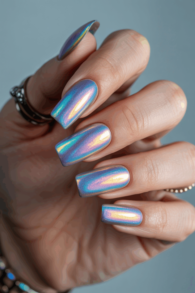 This style works well on short nails. It gives a modern, stylish look without being too bold. Many choose one or two holographic nails paired with solid colors.
