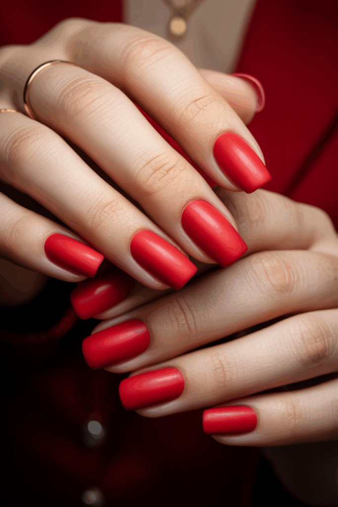 Classic red nails with a matte finish offer a sleek and timeless look. The matte texture gives a soft, velvety appearance that works well for short nails. This style suits many skin tones and fits both casual and formal settings.
