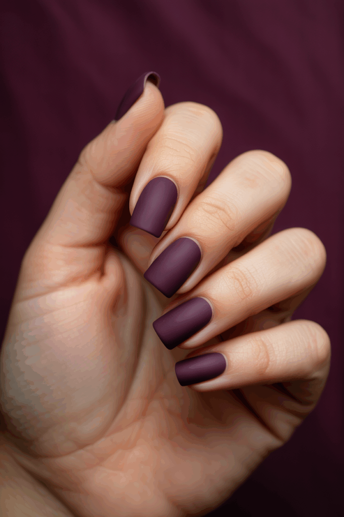 Dark plum nails with a matte topcoat offer a modern, stylish look. The matte finish softens the deep color, giving it an elegant and understated feel. This design works well on short nails, making them appear polished without being flashy.