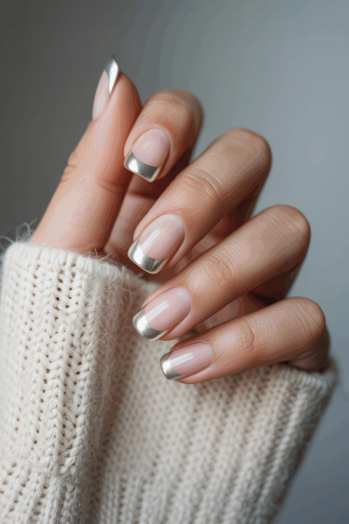 This style updates the classic French manicure by replacing white tips with shiny silver. It works well on short nails and adds a modern, clean look.