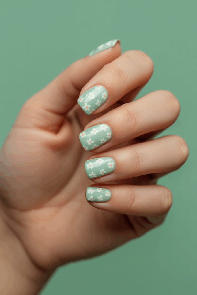 This design pairs a soft mint green base with small white flowers. It creates a calm and fresh look. The tiny flowers add a subtle, delicate detail that suits short nails well. This style works for both casual and slightly dressy occasions.
