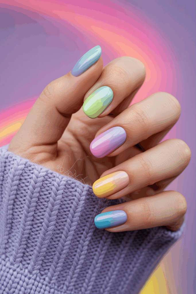 Pastel gradient ombre nails blend soft colors smoothly from light to darker shades. This style works well on short nails, adding elegance without overpowering the hand. It uses colors like pink, purple, and green for a subtle, fresh look.