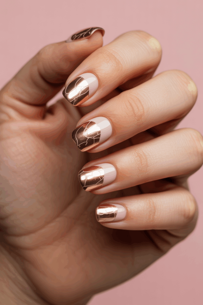 This design uses a soft blush color as a base. Thin pieces of rose gold foil are carefully applied on top.
