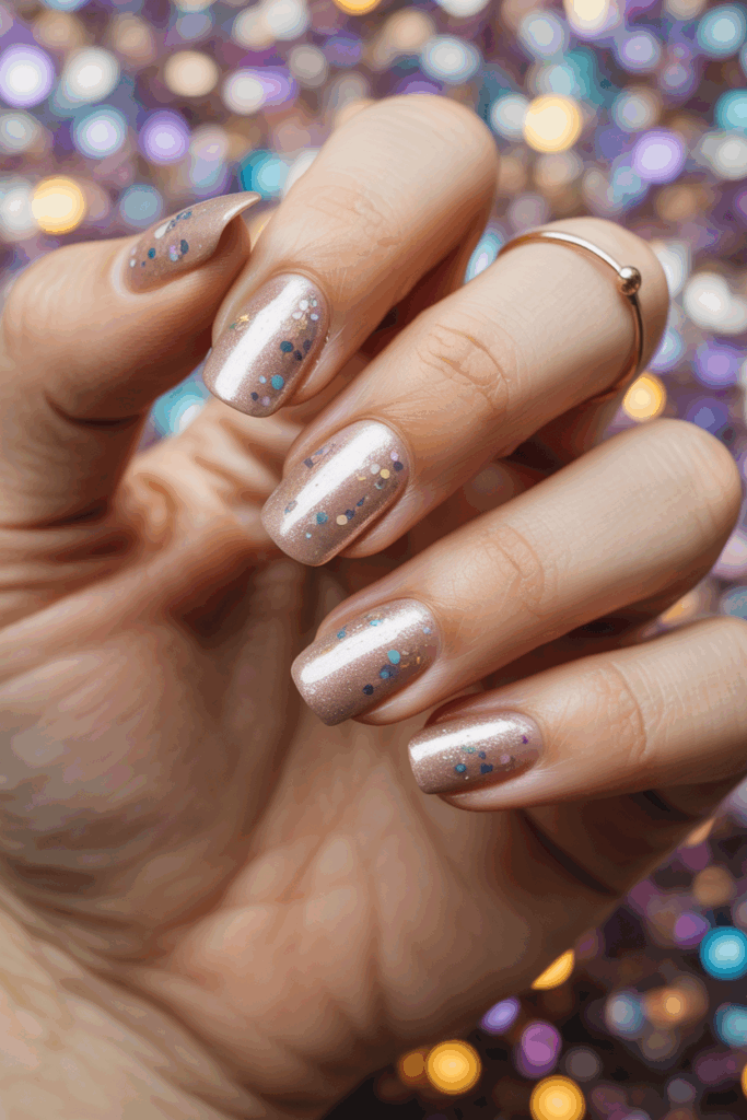This nail idea combines a soft, shimmery champagne base with colorful confetti accents. The light metallic sheen keeps the look elegant.