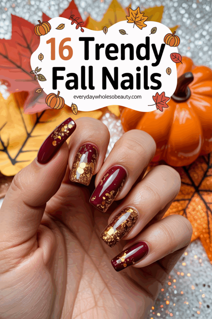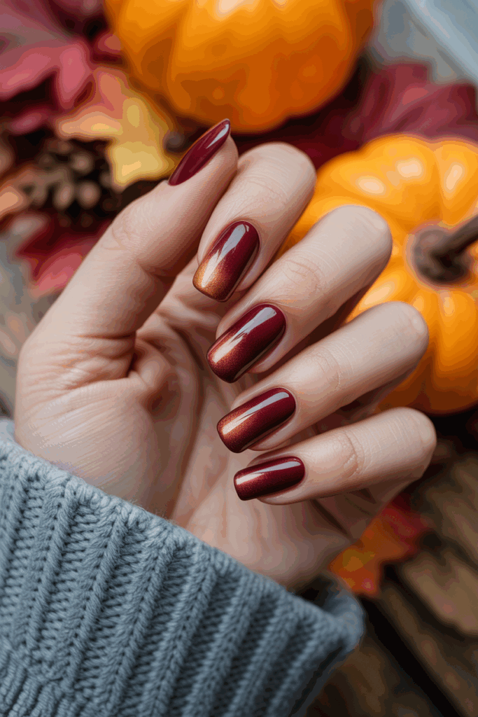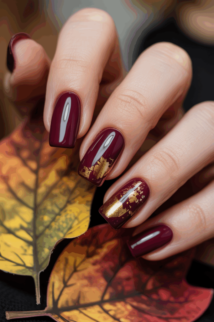 Deep burgundy nails offer a rich and classic fall look. Adding gold foil accents creates a subtle shine that enhances the color without overwhelming it. This combination is simple but stylish, fitting well with autumn’s warm and earthy tones.