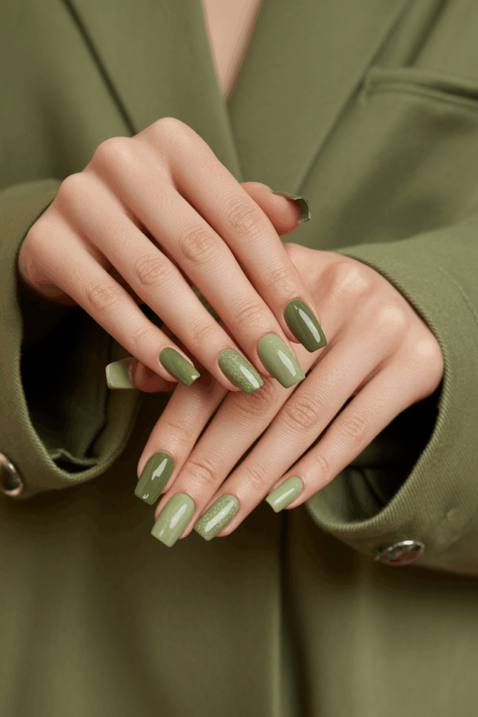 Olive green nails with a touch of glitter add a gentle sparkle without being too bold. This look fits well with fall’s earthy tones and adds a bit of shine for special occasions.