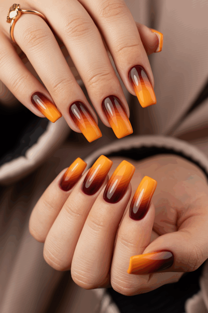 Burnt sienna ombre nails blend warm, earthy tones that fit well with fall colors. The gradient shifts from a soft nude or blush base to a rich, deep burnt sienna at the tips.